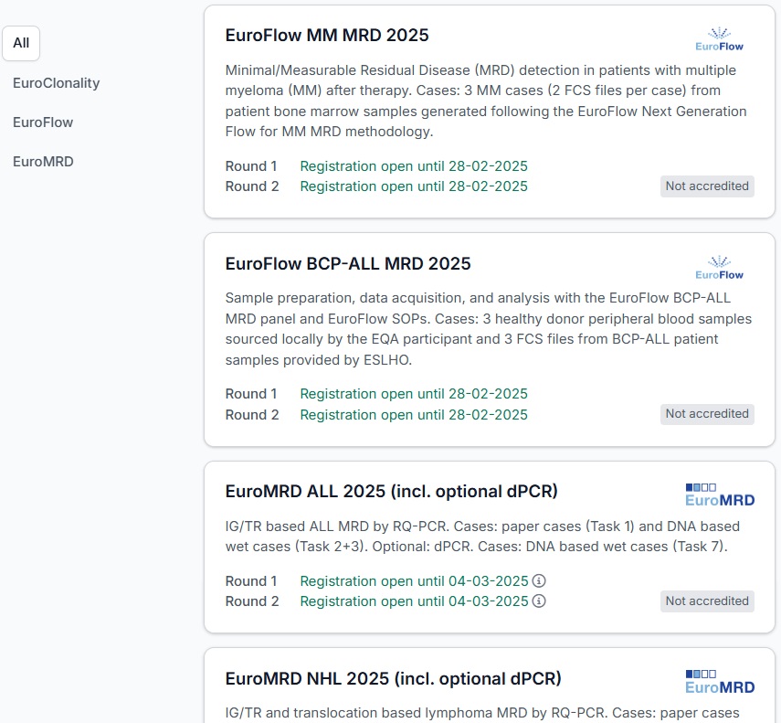 Welcome! Below you can find information about the EQA schemes that ESLHO organizes with the support of the EuroClonality, EuroMRD, and EuroFlow consortia. Once logged in, you can register and manage your active EQA schemes.